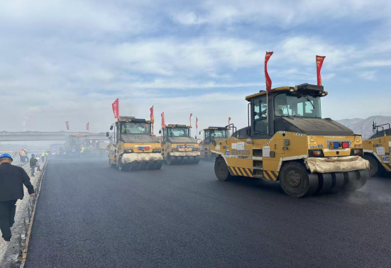 田間的風(fēng)醇厚柔潤,壓路機上隨風(fēng)飄搖的旗幟迸發(fā)出一陣陣吶喊聲,為道路瀝青中面層鋪筑加油助威。