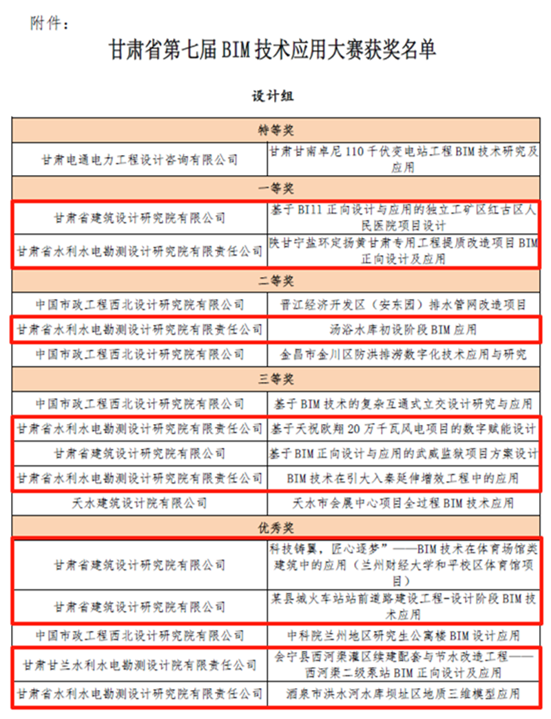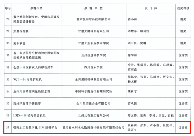 在甘肅省第七屆BIM技術(shù)應(yīng)用大賽中,建筑設(shè)計(jì)院、水電設(shè)計(jì)院報(bào)送的項(xiàng)目共斬獲12項(xiàng)獎勵,包攬了設(shè)計(jì)組16個獎項(xiàng)中的10項(xiàng)。在甘肅省第五屆“創(chuàng)新杯”工業(yè)設(shè)計(jì)大賽中,水電設(shè)計(jì)院《引調(diào)水工程數(shù)字化BIM建模平臺》項(xiàng)目獲優(yōu)秀獎。在第十七屆全省職工優(yōu)秀技術(shù)創(chuàng)新成果獎中,水電設(shè)計(jì)院、土木工程院申報(bào)的兩個項(xiàng)目分獲創(chuàng)新成果獎三等獎,其中,《棄渣場三維設(shè)計(jì)平臺》項(xiàng)目是全省水利系統(tǒng)唯一獲獎成果。