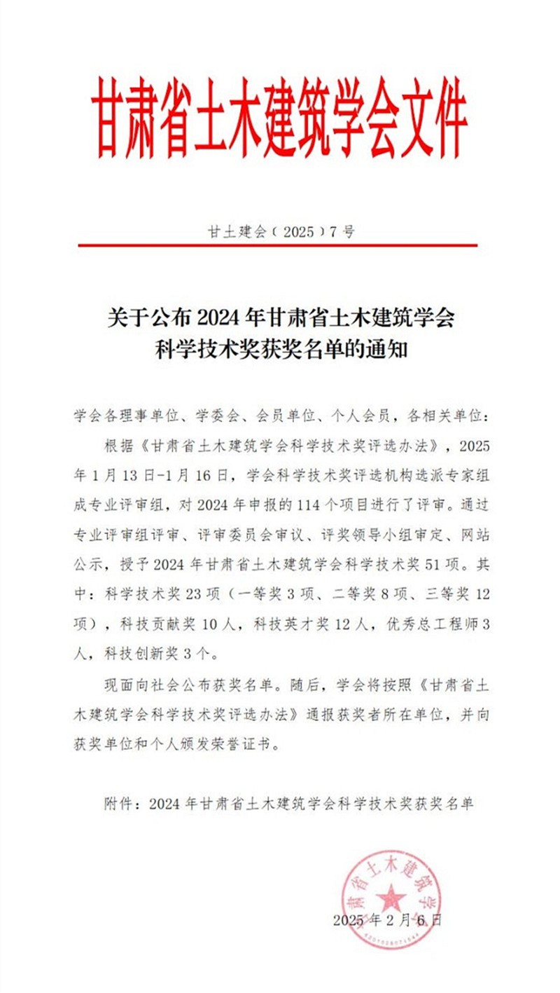 近日,2024年甘肅省土木建筑學(xué)會(huì)科學(xué)技術(shù)獎(jiǎng)獲獎(jiǎng)結(jié)果公布,甘肅工程咨詢集團(tuán)斬獲多項(xiàng)榮譽(yù)。其中,省建筑設(shè)計(jì)院申報(bào)的《咬合樁技術(shù)在深大基坑中的創(chuàng)新與應(yīng)用》項(xiàng)目榮獲“科學(xué)技術(shù)獎(jiǎng)(勘測(cè)科研組)二等獎(jiǎng)”,省城鄉(xiāng)規(guī)劃院申報(bào)的《城市區(qū)域地震災(zāi)害模擬及規(guī)劃研發(fā)平臺(tái)建設(shè)》項(xiàng)目榮獲“科學(xué)技術(shù)獎(jiǎng)(綜合組)二等獎(jiǎng)”,土木工程院參與的《寒區(qū)水工混凝土抗沖磨技術(shù)的開(kāi)發(fā)與應(yīng)用》項(xiàng)目榮獲“科學(xué)技術(shù)獎(jiǎng)(勘測(cè)科研組)三等獎(jiǎng)”。省建筑設(shè)計(jì)院、省城鄉(xiāng)規(guī)劃院4人分別榮獲“科技貢獻(xiàn)獎(jiǎng)”“科技英才獎(jiǎng)”“科技貢獻(xiàn)獎(jiǎng)”“優(yōu)秀總工程師獎(jiǎng)”等榮譽(yù)稱號(hào)。