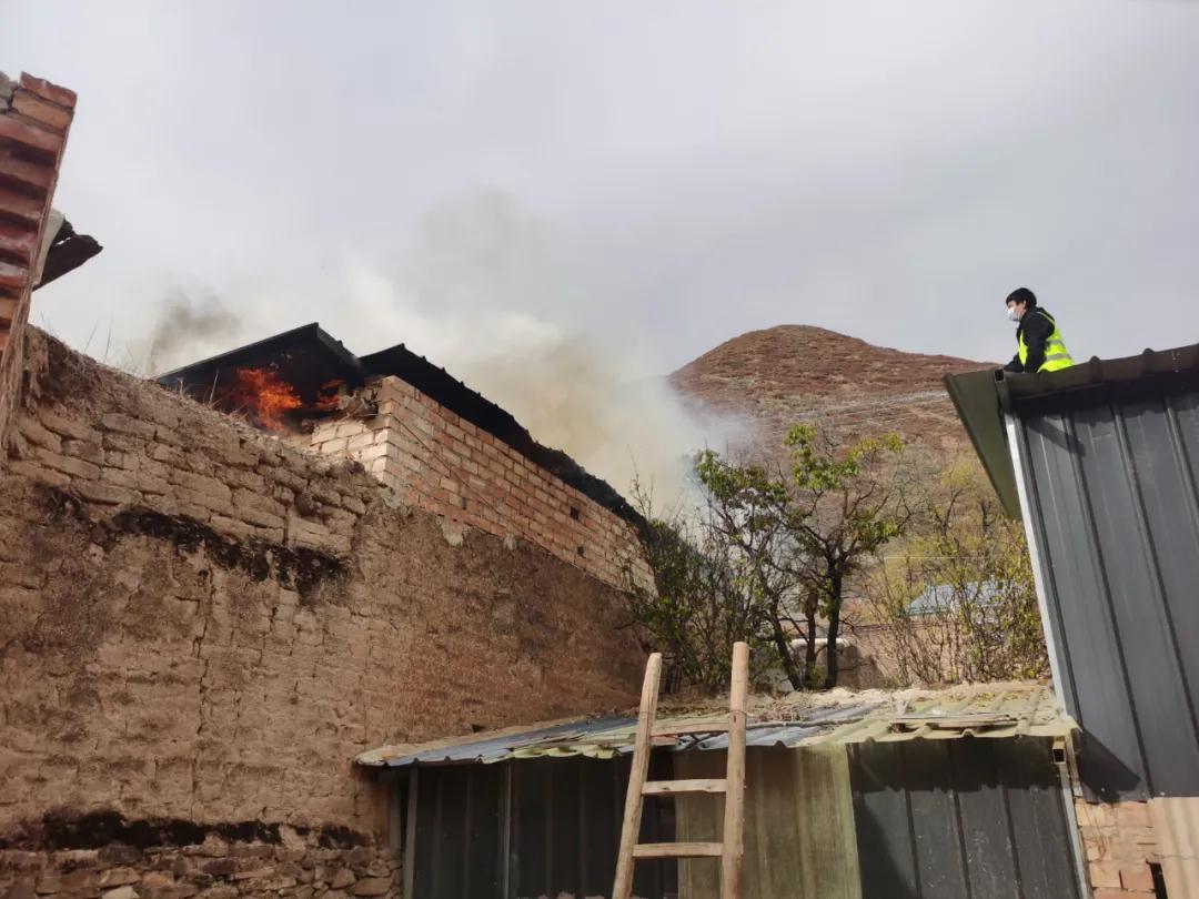 10月30日下午3點,交通監(jiān)理公司負責幫扶的臨潭縣洮濱鎮(zhèn)馬旦溝村一戶村民家中突然冒出滾滾濃煙,火光在濃煙中忽隱忽現(xiàn)。著火是一座磚木結構彩鋼屋頂?shù)男路?,火從屋頂燒起,越燒越旺。著火的房屋旁邊堆放著多年的老柴火,干燥異常,一絲火星就能點燃,而與著火點緊鄰著的就是布局緊密的鄉(xiāng)親們的房屋,再往外圍則緊接著山林,如果火勢蔓延,后果將不堪設想。
