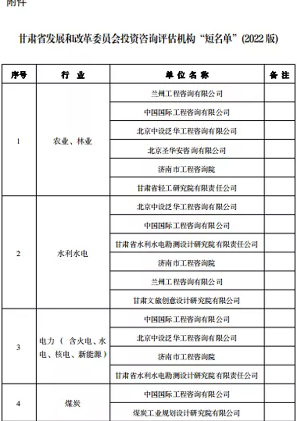 近日,省發(fā)改委公布2022年進(jìn)入省發(fā)改委投資咨詢評估機(jī)構(gòu)企業(yè)名單,甘肅省水利水電勘測設(shè)計研究院有限責(zé)任公司成功入圍三個行業(yè)板塊。
