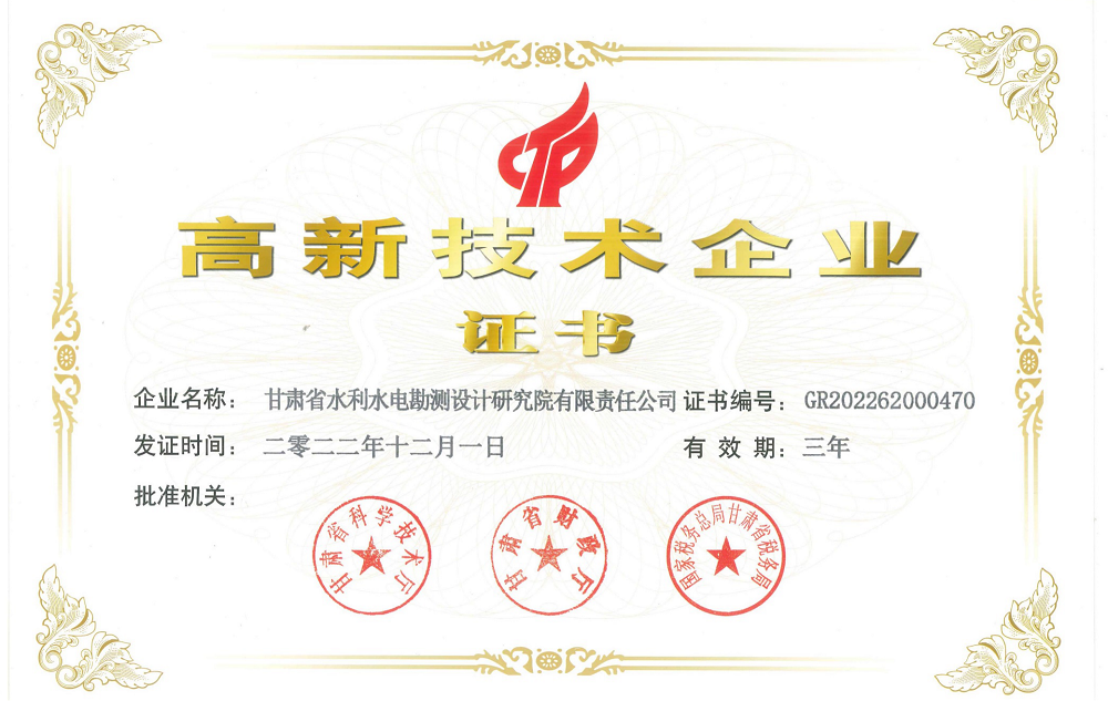 日前,甘肅省水利水電勘測設(shè)計(jì)研究院有限責(zé)任公司獲得甘肅省科技廳、甘肅省財(cái)政廳、國家稅務(wù)總局甘肅省稅務(wù)局聯(lián)合頒發(fā)的“高新技術(shù)企業(yè)證書”(證書編號(hào):GR202262000470),標(biāo)志著水電設(shè)計(jì)院正式邁入國家高新技術(shù)企業(yè)行列,是企業(yè)發(fā)展的又一個(gè)重要里程碑。