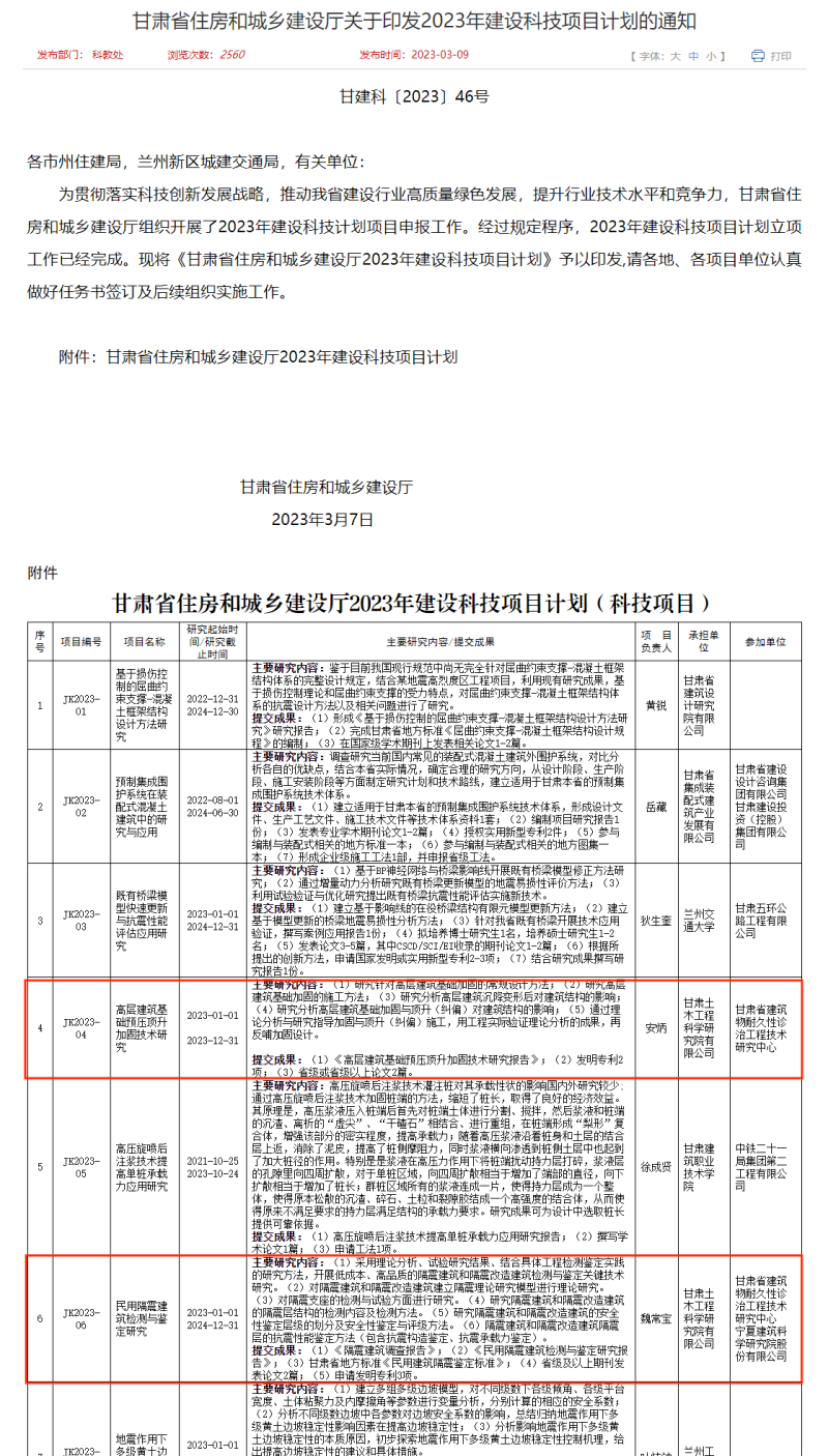 近日,從《甘肅省住房和城鄉(xiāng)建設(shè)廳關(guān)于印發(fā)2023年建設(shè)科技項目計劃的通知》(甘建科〔2023〕46號)獲悉,由土木工程院組織申報的兩項科技攻關(guān)項目《高層建筑基礎(chǔ)預(yù)壓頂升加固技術(shù)研究》(立項編號JK2023-03)、民用隔震建筑檢測與鑒定研究(立項編號JK2023-06)和兩項軟課題《2022-2023年度甘肅省民用建筑能耗統(tǒng)計數(shù)據(jù)分析與研究》(立項編號JK2023-45)、《2022年度甘肅省建筑能耗監(jiān)測平臺的能耗數(shù)據(jù)分析與研究》(立項編號JK2023-46)成功獲批立項。