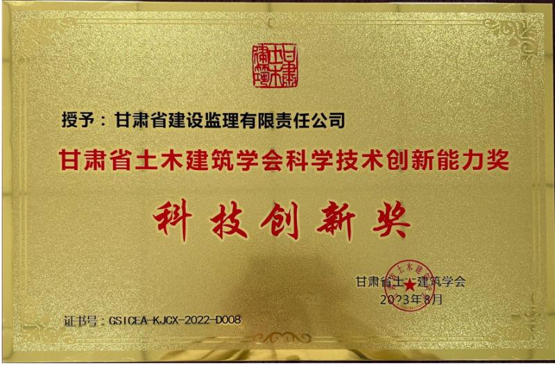 近日,省建設監(jiān)理公司榮獲“甘肅省土木建筑學會科技創(chuàng)新獎”。此獎項充分肯定了公司核心技術能力,彰顯了公司的品牌實力和行業(yè)影響力。