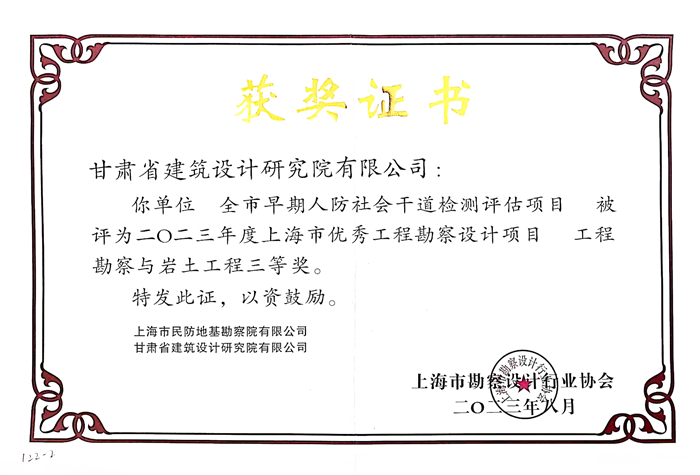 近日,上海市勘察設(shè)計(jì)行業(yè)協(xié)會(huì)公布了2023年度上海市優(yōu)秀工程勘察設(shè)計(jì)項(xiàng)目獎(jiǎng)評(píng)獎(jiǎng)結(jié)果,省建筑設(shè)計(jì)院檢測(cè)中心提交的“全市早期人防社會(huì)干道檢測(cè)評(píng)估項(xiàng)目”榮獲2023年度上海市優(yōu)秀工程勘察設(shè)計(jì)項(xiàng)目工程勘察與巖土工程三等獎(jiǎng)。