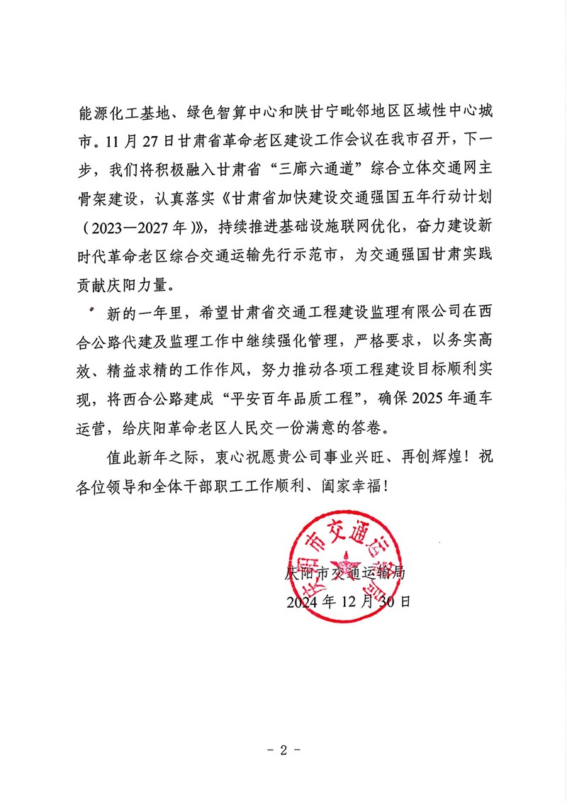 12月30日,甘肅工程咨詢集團(tuán)收到慶陽市交通運(yùn)輸局的感謝信,向省交通監(jiān)理公司在G309線合水(老城)至西峰段公路項(xiàng)目建設(shè)過程中作出的貢獻(xiàn)表示感謝。