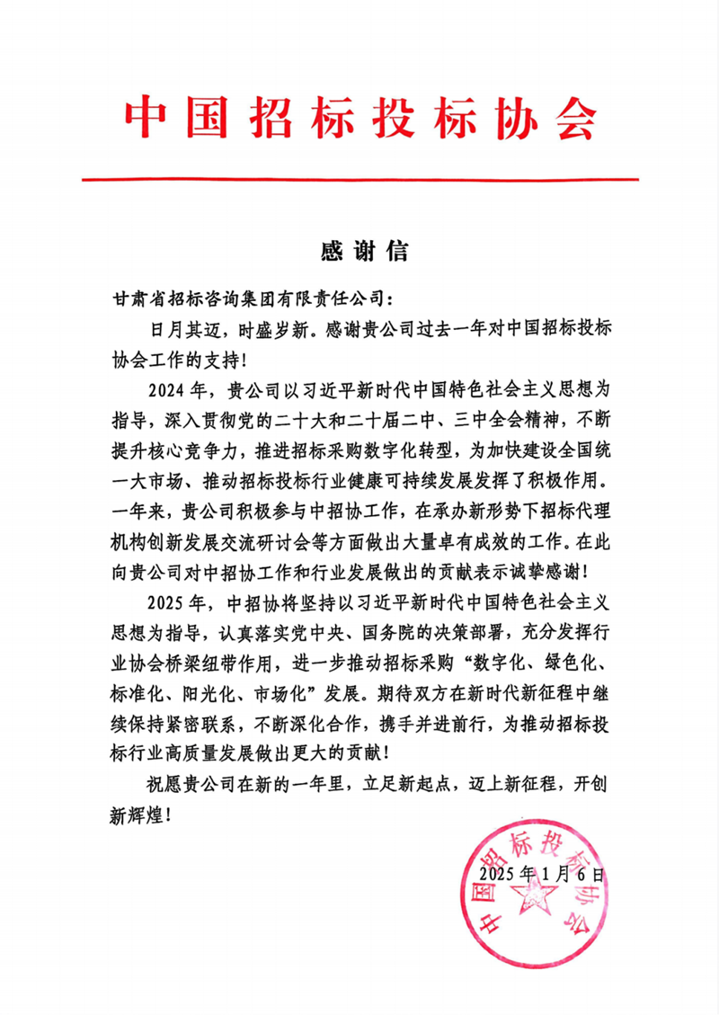 近日,省招標(biāo)集團(tuán)收到來(lái)自中國(guó)招標(biāo)投標(biāo)協(xié)會(huì)(下稱(chēng)“中招協(xié)”)的感謝信,感謝省招標(biāo)集團(tuán)作為中招協(xié)常務(wù)理事單位為招標(biāo)投標(biāo)行業(yè)發(fā)展作出的積極貢獻(xiàn)。
