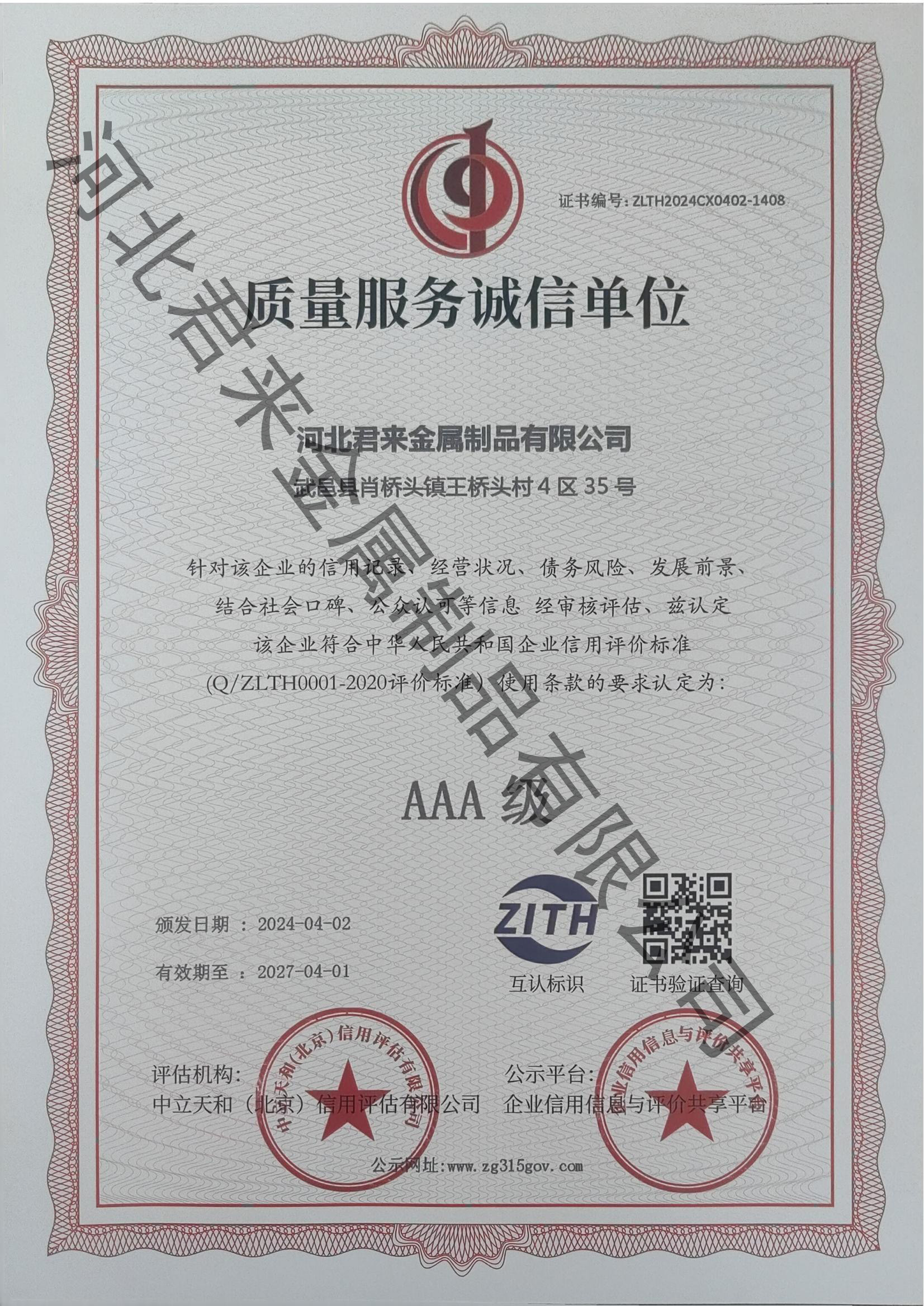 質(zhì)量服務(wù)誠信等級證書